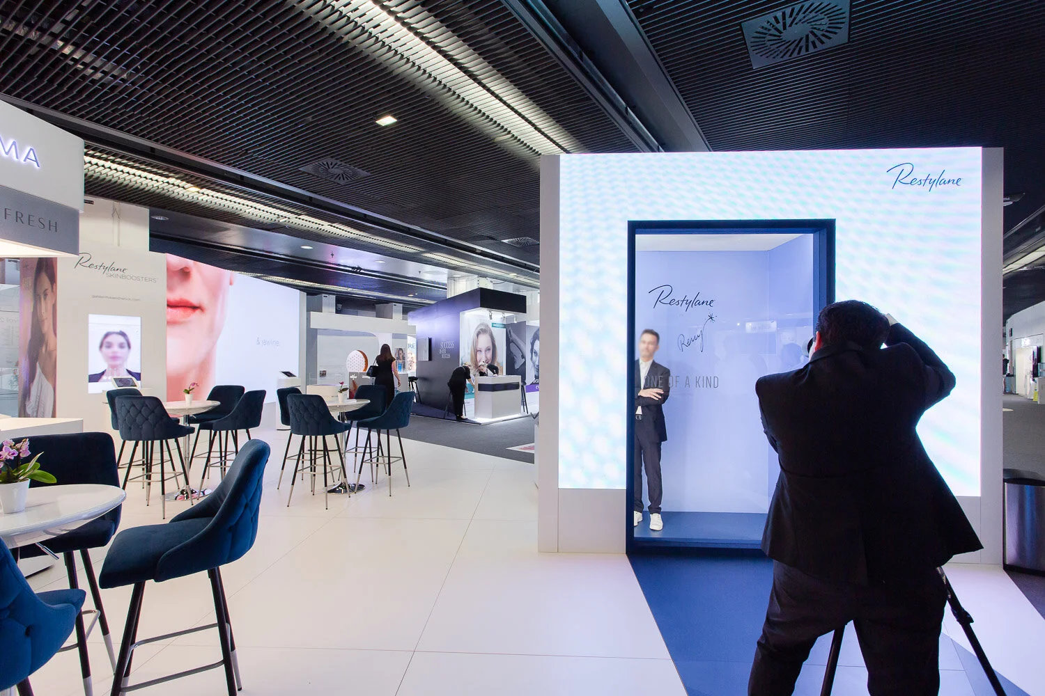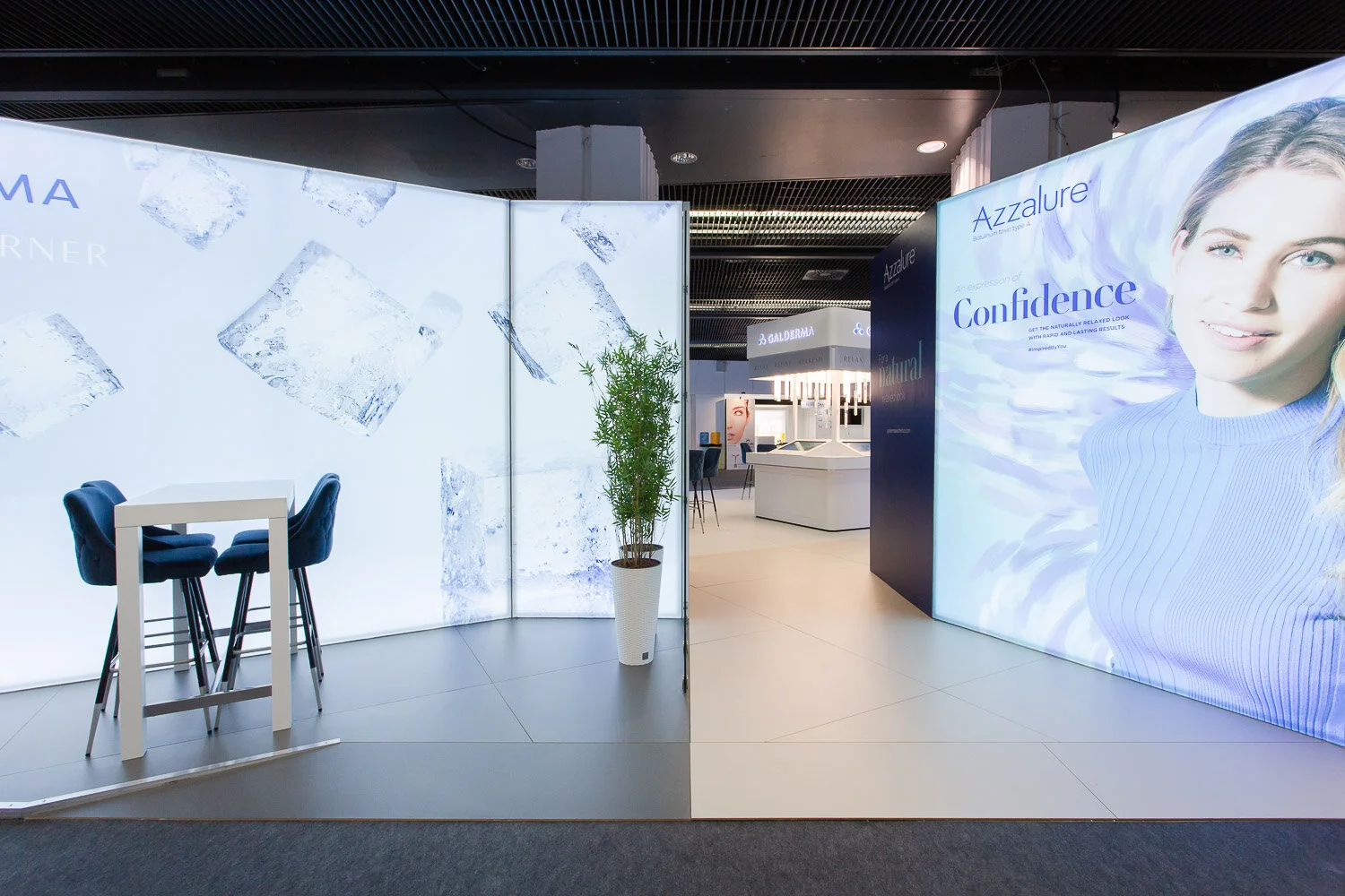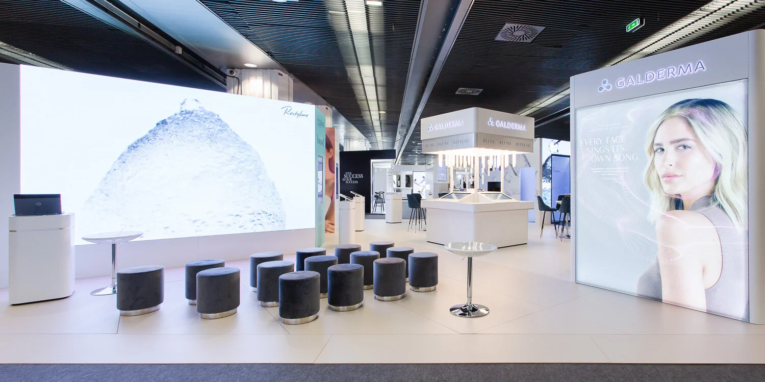 The booth’s aesthetics were to be premium, chic and glamorous to create a wow factor and to deliver impact. To help bring their messages to life, Galderma’s booth needed to embrace digital technology and allow for flexibility with content shown during the show.