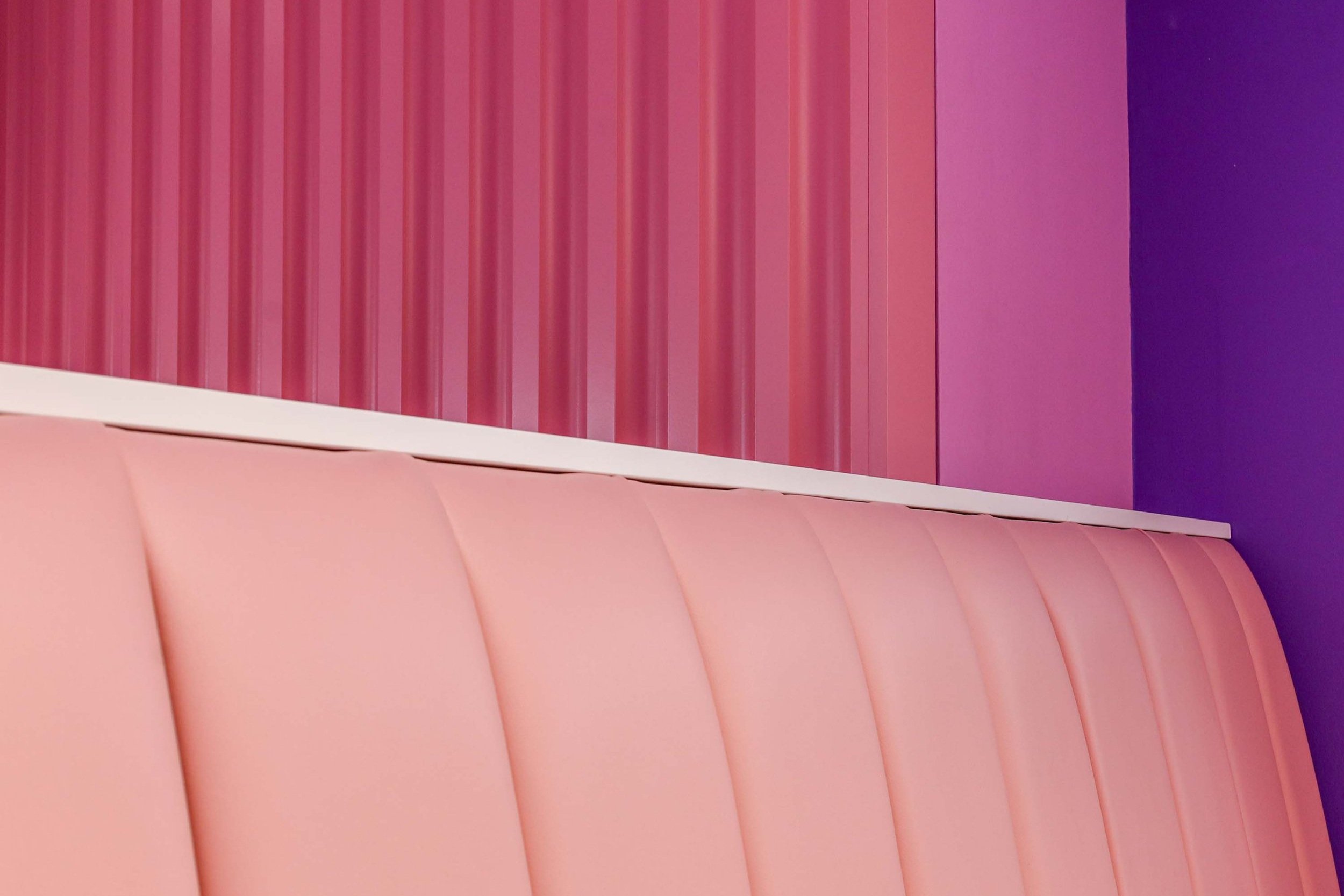 The candy colourway is used not only with furniture and joinery, but for all surfaces. The space features flooring tiles in lavender and coral, whilst the ceiling is painted in a deeper shade of purple. The all-pink furniture is a mix of bespoke-designed banquettes, upholstered in faux leather, and loose chairs in a pink matte metal with white tips to the legs. The third colour in the main palette – a warm peppermint green, is used sparingly for sections of the wall – with pink also used again here, creating constant visual interest and allowing for easy segregation into different seating areas and activity zones.