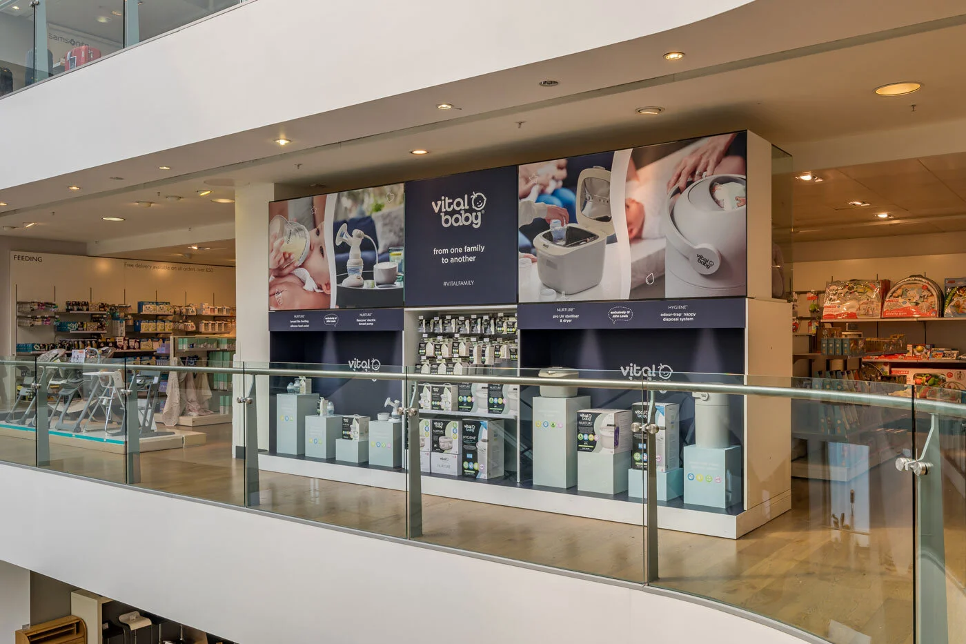 Istoria Group partners with baby accessories brand Vital Baby on their retail design and exhibition programmes. We created a new concept for their booth at Europe’s leading tradeshow for the infant and child retail market with a distinct stand architecture and all graphic elements, whilst also future-proofing the concept. We advised on product category breakdowns and created single examples of display items. The result was a well-segmented stand that offered a clear customer journey, focus product areas and impactful communications through a variety of presentation and merchandising methods. We also created a pop-up retail concept in John Lewis Oxford Street.