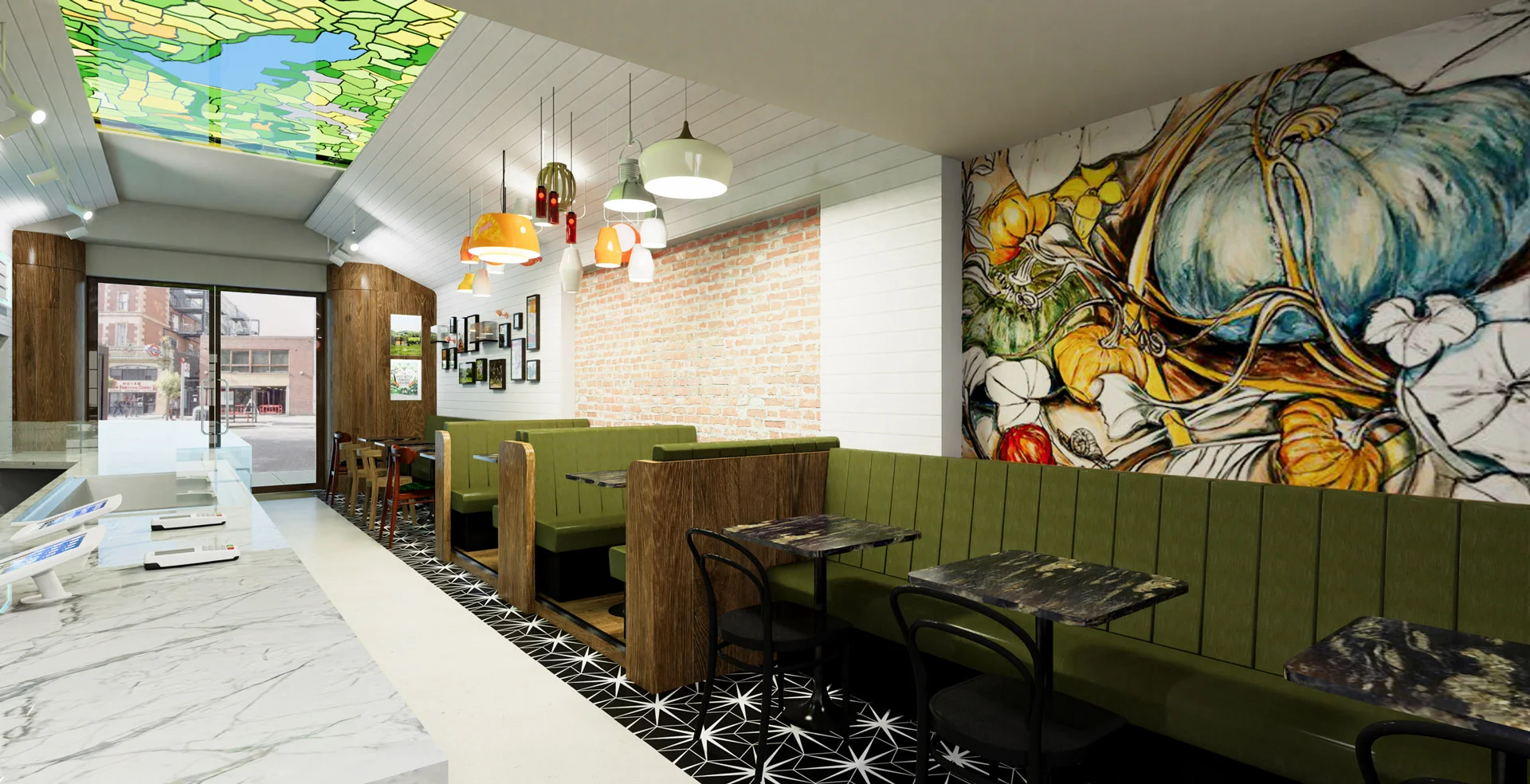 Showcasing Yeo Valley’s brand story and quirky personality, the design includes feature product displays, an abstract stained-glass-style map of the Yeo Valley farm, and a garden-inspired mural by brand artist, Natasha Clutterbuck.